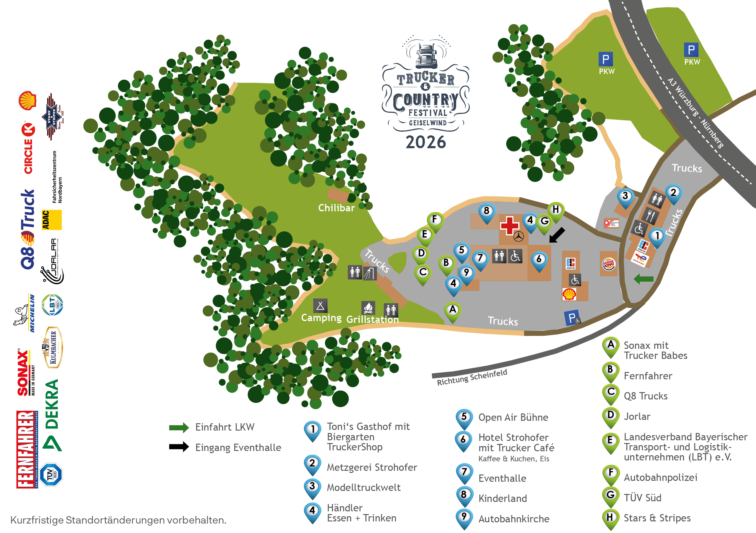 Festplatz mit Ständen, Partnern und vielen LKWs